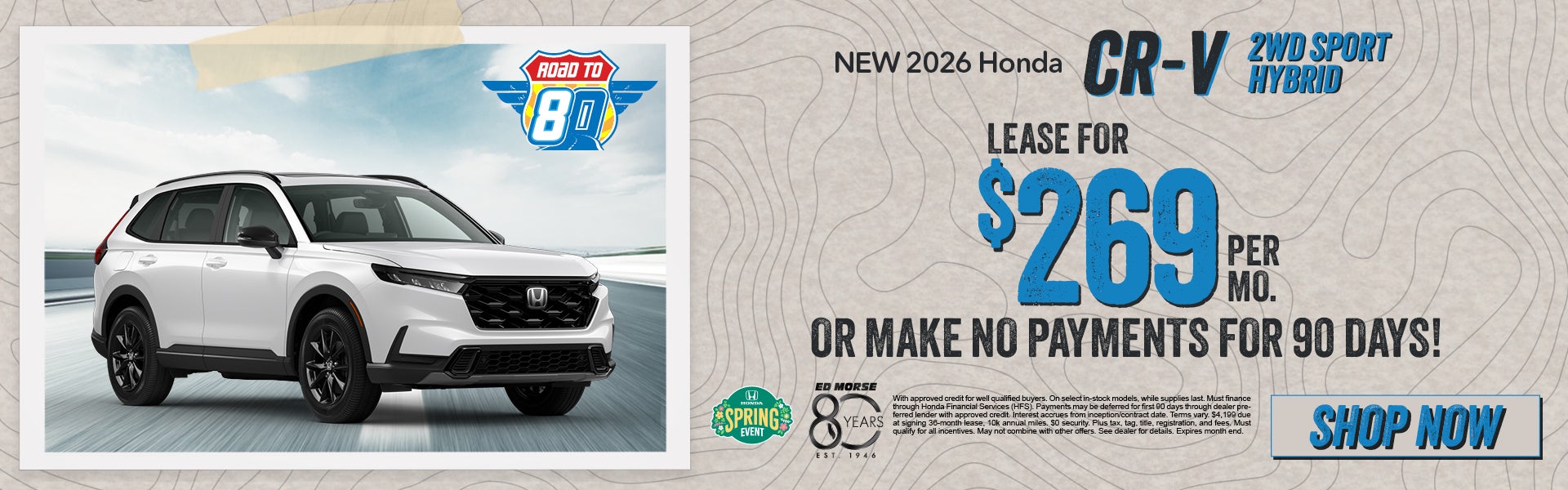 With approved credit for well qualified buyers. On select in-stock models, while supplies last. Must finance through Honda Financial Services (HFS).Payments may be deferred for first 90 days through dealer preferred lender with approved credit. Interest accrues from inception/contract date. Terms vary. $4,199 due at signing 36-month lease, 10k annual miles. $0 security. Plus tax, tag, title, registration, and fees. Must qualify for all incentives. May not combine with other offers. See dealer for details. Expires 4/30/26.